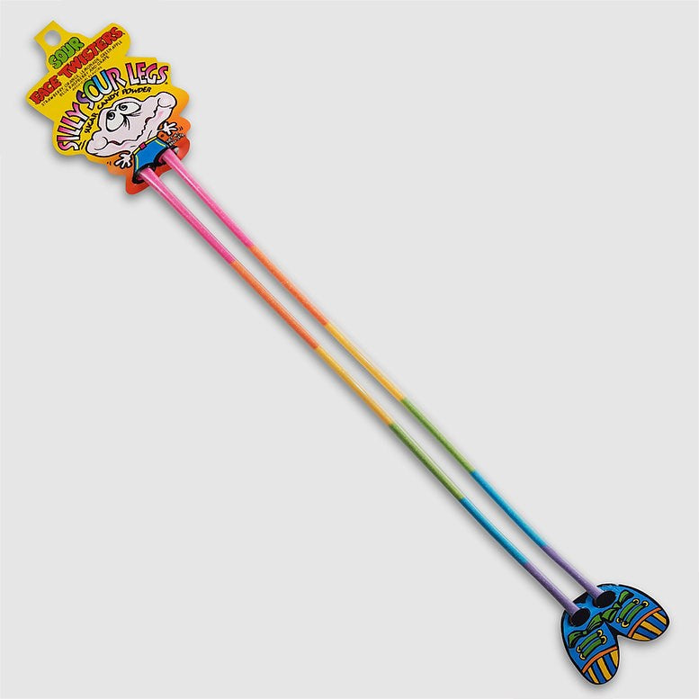 Each unit features two 2-1/2 foot long legs filled with a rainbow effect of six fruit-flavored sour powders.